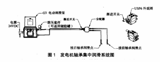 发电机轴承集中润滑系统图如图1所示。该系统的主要配件组成包括G3PRO自动润滑泵1台,UPS递进式分配阀和泄压回流阀各1个,循环渐进开关各1个,管路,接头,开关和支架等。