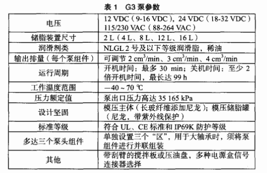 内置控制器具备定时开关机、密码保护和低液位报警等多种功能。G3PRO自动润滑泵的详细参数如表1所示。