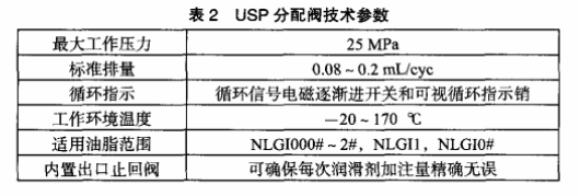 USP递进式分配阀采用整体递进式设计模块,配备6~16个出油口,出油口可以合并,以满足较大轴承的大润滑量的需要。内置出口止回阀可确保每次润滑剂加注量精确无误,与循环信号电磁渐进开关配合使用,可以保障润滑的功能。USP分配阀的技术参数如表2所示。