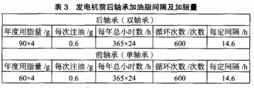 发电机轴承每年的油脂耗量为单轴承240g,双轴承360g,单、双轴承油脂耗量之比为2∶3,总量为600g。