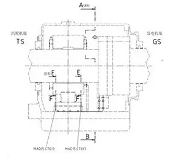 该类型机组5号轴承共两组瓦温保护30MAD15CT013、30MAD15CT017(如图),每组保护测点是三支热电偶共为一个探头、一根引出电缆。机组运行中出现30MAD15CT017测点有两支故障(坏点30MAD15CT017A、30MAD15CT017B,好点30MAD15CT017C),判断原因为在润滑油长时间冲刷下,由于热电偶引出电缆固定线卡太少,易碰磨轴承箱边角部位,电缆磨损所致。
