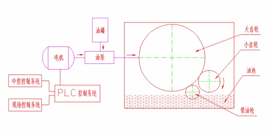 为了彻底解决上述问题,避免齿轮润滑不良导致的齿轮磨损严重,减少因原润滑结构的带油轮频繁损坏停车而影响正常生产,充分提高润滑效率,实现现场与中空共同监督、控制,使系统实现自动化控制。该公司于2010年11月份,在原润滑系统形式的基础上进行了创新改造,彻底解决了存在的问题和润滑弊端。