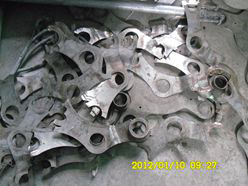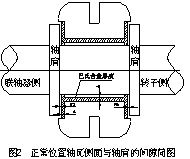拆去电机前轴瓦上盖后,即发现下瓦座在靠近联轴器侧的空隙中有大量的巴氏合金碎片(见图4),证实了前面轴瓦受损的判断。拆下上轴瓦检查,轴瓦工作面无损伤,但靠近联轴器侧的轴瓦侧面的巴氏合金已被轴肩严重磨损,原来4mm(见图2)的厚度只剩下1.5mm(见图3)。再检查下轴瓦,发现下轴瓦的侧面已与轴肩紧密接触,轴瓦侧面的巴氏合金被磨损也是必然的了。
