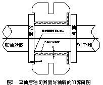 根据轴瓦侧面与轴肩接触摩擦情况来看,可以肯定是电机主轴向尾部窜动了,且窜动量较大,至少有5mm(轴瓦侧面与轴肩原有2.5mm的间隙,现在轴瓦侧面的巴氏合金又被磨损掉2.5mm,二者之和为5mm),那么找到电机主轴为什么会向后窜动则是解决问题的关键。