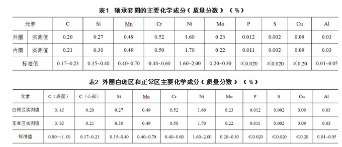 在套圈正常部位进行取样,原材料化学成分分析结果如表1所示,可见其主要化学成分符合《TB/T2235—2016铁道车辆滚动轴承》有关G20CrNi2MoA电渣重熔轴承钢成分的技术要求。采用电子探针对外圈的白区和正常区化学成分进行分析,结果如表2所示,显然白区的含碳量低于《JB/T8881—2011滚动轴承零件渗碳热处理技术条件》规定的标准值。