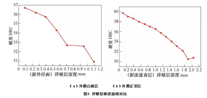用维氏硬度计检测轴承内外圈纵截面的表面硬度及淬硬层的梯度分布,并且对轴承内外圈的白斑区和颜色正常区域分别进行了检测,其白斑区和正常区表面硬度及淬硬层深度对比结果如表4所示,外圈白斑区与正常区域淬硬层梯度曲线对比如图4所示,图4a为外圈白斑区淬硬层硬度梯度曲线,图4b为外圈正常区淬硬层硬度梯度曲线。