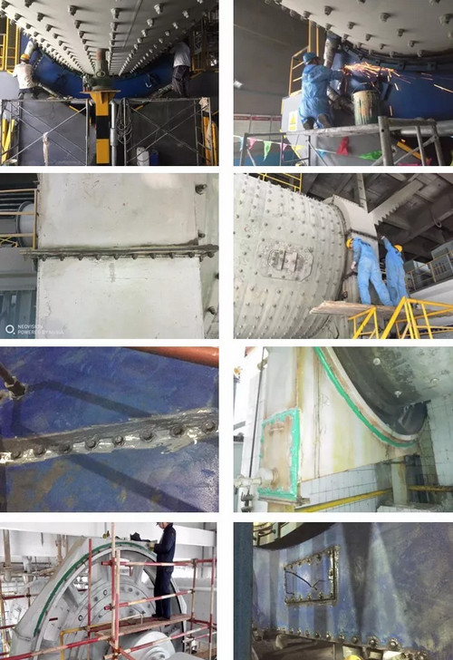 对于球磨机齿圈护罩及底座结合处采用高分子复合材料和技术现场治理渗漏,不用拆卸,采用高分子复合材料在外部治理渗漏,省时省力,效果立竿见影,其产品具备的优越的粘着力、耐油性及良好的拉伸延展性,克服球磨机振动造成的影响,很好地为企业解决了传统工艺难以解决的问题。此类应用以福世蓝产品较为可靠。