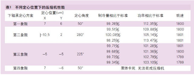 在相同型号的压缩机试验,对泵体装配时分别以不同的定心位置进行装机,并在相同的条件下测试压缩机性能,结果如表1所示。