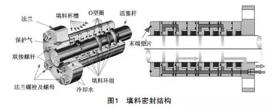 填料部件的组成结构,如图1所示。填料环组安装在填料杯槽内,每个填料杯槽间采用O型圈密封的方式。组装结束后,通过螺栓将整个填料部件和气缸的轴侧连接,加之合适的预紧力既保证了填料环槽之间的密封,也保证了填料盒末端通过末端垫片与气缸的密封。根据需要,填料部件设置有润滑、冷却、保护气和漏气回收。