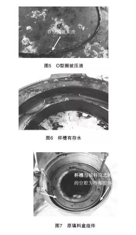 (3)填料盒结构不合理,如图7所示,筒深超过400mm,填料杯槽安装困难,容易出现O型圈压偏以至螺栓紧固后出现压断的现象。此外,原填料盒的冷却水腔全部在杯槽外侧,离工作的填料环组较远,不能有效带走热量。