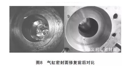 (1)机组解体,将各级气缸末端密封面进行机械加工修复,表面粗糙度要求为Ra1.6。修复前后的气缸密封面如图8所示。