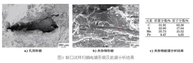 对图1所示低倍试片A和B两处进行锯切,制成200mm×20mm×15mm(长×宽×厚)的条形试样,并在其背部刻出一深3mm、宽3mm的槽后在落锤试验机上打开形成断口。断口扫描电镜(SEM)形貌见图3a),可见断口上存在不规则孔洞,且孔洞内壁粗糙,无明显方向性。此外,在解理断口上还发现有贯穿的夹杂物条带,见图3b);能谱(EDS)分析其主要成分为MnS,见图3c)。