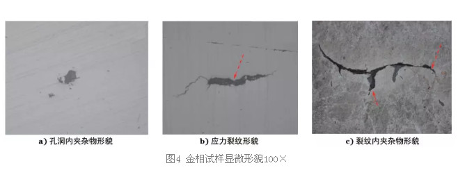 由于MnS的热膨胀系数大于基体,因而在冷却过程中,其收缩速率比钢基体的要快,产生占其体积1.1%的空隙,使基体与夹杂物交界处产生拉应力,在基体材料中形成割裂,在锻造过程中无法焊合,成为裂纹源,图4c)所示的裂纹较好地印证了这一点。