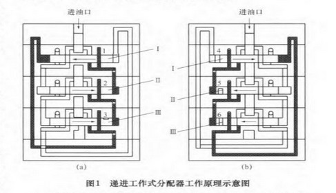 递进工作式分配器工作原理:主要有片式和块式两种类型,在润滑系统中多采用片式分配器,即每一个递进工作式分配器都由3个起始片、3个终止片和至少3个中间片组成,中间片的数目从理论上来说可以是N片,但不管数目是多少都可以和起始片及终止片组成一个完整的整体。中间片每1片均有1个工作活塞和2个出油口,出油口设在中间片的左右两端。图1a所示原理图,泵送润滑剂通过进油口流入分配器,通过环形槽到达活塞Ⅱ和活塞Ⅲ左端,并推动它们向右移动,使活塞容腔中的润滑剂依次从出油口1和2排出。而当活塞Ⅲ到达右端极限位置后,进入分配器的润滑剂又通过左边的环形槽到达活塞Ⅰ的右端,推动活塞Ⅰ向左移动,使活塞容腔中的润滑剂从出油口3排出;而图1b所示的过程在活塞运动方向上正好相反,相应的润滑剂依次从出油口4、5、6排出。只要进入递进工作式分配器的润滑剂维持一定的压力,分配器就可以连续工作。只要任何一个中间片中的活塞卡死不能动作,其它中间片的活塞就会全部受阻,整个分配器将停止工作,只要在中间片设置感应活塞动作的接近开关,可以在活塞受阻时及时报警。