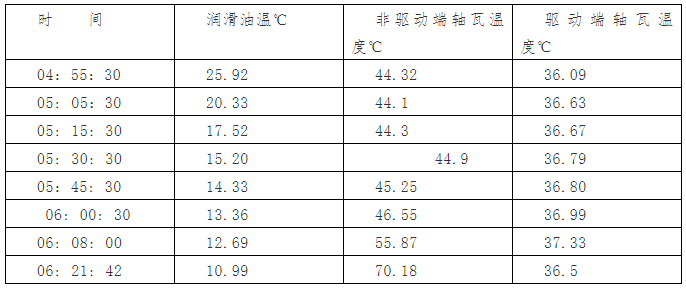 磨机轴瓦温度高跳闸后,立即派人到就地检查,发现润滑油站供油泵运行正常,油站系统各阀门没有异动痕迹,通路正常,供油压力略有升高,非驱动端轴瓦润滑油布油管无油流出、已经断油,驱动端轴瓦润滑油布油管有油流出,油量偏小。同时,在DCS上查供油系统有关历史趋势,发现油温在04时50分到06时07分这段时间由25.92℃降到12.69℃,其余参数无明显变化。下表是投入冷油器运行后油温和轴瓦温度的变化情况: