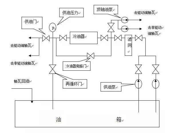某厂2号机组锅炉配备四台BBD-4060低速双进双出钢球磨煤机,装球量77吨,磨机两端由两块表面镀有易熔乌金的轴瓦支撑,两端轴瓦由图1所示的油站进行供油润滑,润滑油为150号工业润滑油,由油站出口分别经一根直径约3厘米约6米长的供油管道到驱动端轴瓦,经一根直径约3厘米约14米长的供油管道到非驱动端轴瓦。两道轴瓦均设有温度高保护,轴瓦温度达50℃报警、55℃跳闸磨机。