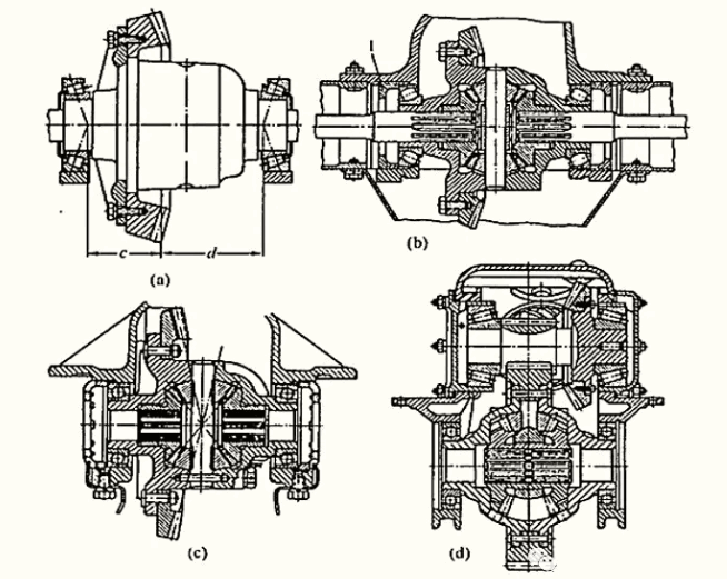 3、两端支承多采用圆锥滚子轴承,安装时其大端相向朝内,小端相背朝外。为使载荷尽量均分在两个轴承上,且让出位置来加强从动齿轮连接突缘的刚性,应尽量使c≥d;