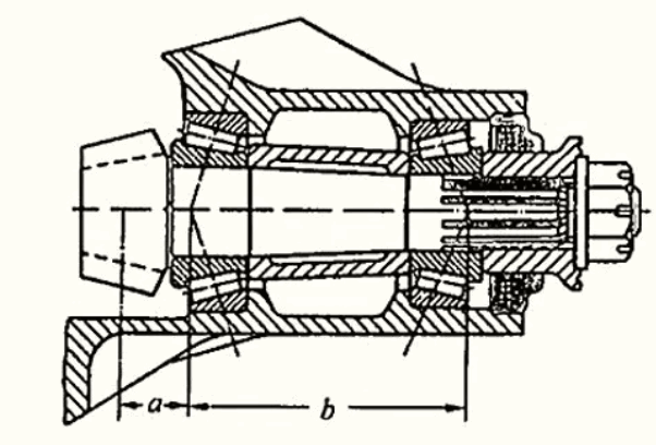 (2)、一对圆锥滚子轴承支承时:为了减小悬臂长度a、增大支承距离b,应使两轴承圆锥滚子的小端相向朝内、大端朝外,从而使b拉长、a缩短,以此增强支承刚度;