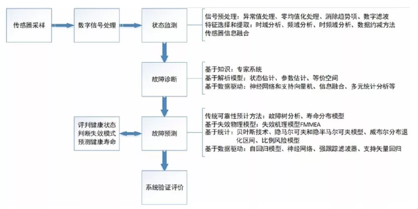 随着对设备检测要求越来越多越来越高,非常需要有一套完整的、好用的、智能的、可靠的、系统的解决方案。故障预测与健康管理技术(Prognostics and Health Management,PHM)系统的出现,不论是在学术界还是在工业界,都有很多人在关注。PHM是将各种监测数据经过一系列处理,包括降噪、特征提取、健康状况评估及剩余寿命预测的一整套完善的系统。对于滚动轴承的健康管理系统来说,其包括对原始数据预处理、特征值选择与提取、故障模式识别、性能退化评估、性能趋势预测和提供维修决策等步骤。滚动轴承的PHM基本流程和常用方法见下图。