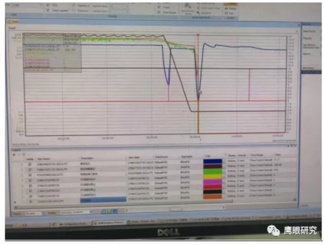 19:35 巡检发现#2 机组大机机头处有油烟冒出,立即汇报值长并至就地检查发现 6.9 米高调阀油动机附近大量喷油,19:36:58 抗燃油油压低至联启值 8.97Mpa,2A 抗燃油泵联启正常。19:38:36抗燃油油箱液位从118mm 快速下降至-100mm,(报警值说明),19:42:23抗燃油油压低至7.89Mpa,汽机跳闸,锅炉MFT,发电机跳闸,FSSS首出为“汽机跳闸”,ETS首出为“抗燃油压力低低”。