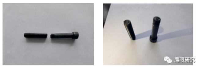 根据“O”型圈断口形态,初步判断2号机组大修时更换的机械遮断阀“O”型圈存在质量问题,决定扩大检查范围,对同批次机械遮断阀“O”型圈进行全部更换。使用力矩扳手按照45N•m标准对机械遮断阀螺栓进行紧固,紧固过程中发现#2中调门、#1高主门各有一条螺栓断裂(螺栓规格3/8-16*3-1/4,强度等级12.9)。详见下图: