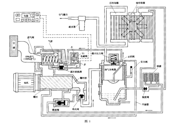 电脑有加载指令输出,电磁阀Yl有动作,封住电磁阀Y1 A口,B口与C口相通,来至油坦克的控制空气进入到膜片转换阀,推动膜片向上运动,将膜片上部进气口封住,控制高压空气进入到进气阀气腔内,进气阀动作,空压机进气口打开,100%空气进入到螺杆腔内,压缩后的高温高压油、气混合物通过单向阀,沿油气分离器外壁切线方向进入油坦克内,85%的油从油气混合物中分离出来,剩下15%的油粘在油气分离器外壁表面分离,少部分油进入油气分离器内部。