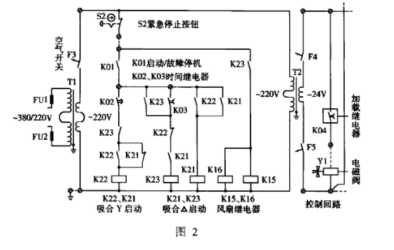 所谓加载,就是根据生产所需Z低压力设定螺杆空压机Z低压力启动值(即空压机运转为带载运行),低于此值就开始升压。16m3螺杆空压机电气工作原理见图2。