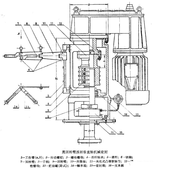 当进行拆卸机械密封时,应先卸除釜内压力,拧松传动螺钉(2),均匀地旋松联轴节的连接螺母(12),由轴的自重作用使轴的台肩座落在支承板(16)上,然后拆除螺栓(3)和(12),用手动升举机构控制升降座至适当高度,把工作臂回转到联轴节的凸缘下面支持之,再用螺栓插入凸缘上螺钉孔和工作臂上的长孔后将联轴节从支架开孔处回转出来,利用手动升举机构把提取物降落到工作台上。