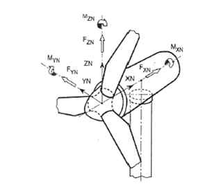 在运行中,一个径向力主要来自重力,一个水平力主要来自风。转子的轴向力和倾覆力矩来自叶片。用来做分析比较的工况是由恒速16转/分钟下500多种不同受力情况合成的一个当量载荷工况。