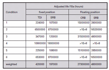 (图中英文注释: condition – 工况;Adjusted Life – 调整寿命; Fixed Position – 固定端; Floating Position – 浮动端;TDI – 双列圆锥滚子轴承;SRB – 调心滚子轴承; CRB – 圆柱滚子轴承;weighted: 平均值)