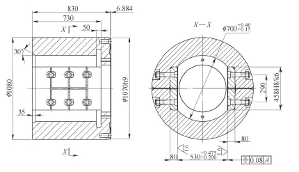 (1)整体结构 原辊端轴套为衬板结构,衬板通过螺栓与轴套联接,工作过程中衬板受力作用造成螺栓松动。改进后设计方案为无衬板整体结构,避免螺栓松动的发生。