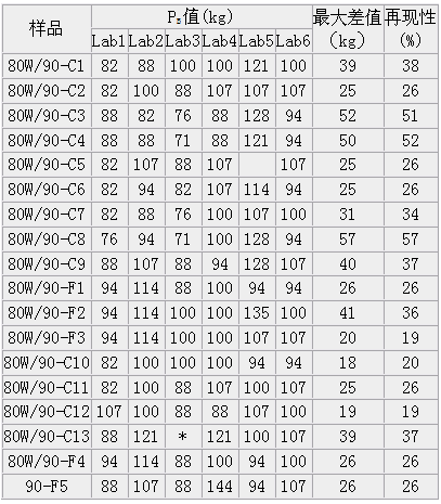 由表1可见:(1)对于中国市场知名品牌的GL-5齿轮润滑油,半数左右其PB值小于100kg,说明PB值本身不能代表承载能力。(2)不同实验室(lad)之间的测试结果,对于个别油品其再现性有超出规定的30%,缺乏可比性。可以认为,不同实验室测量者本身是严格按照操作规程进行测试的,产生偏差的原因可能是钢球的生产批次不同,造成其材质有差异,从而影响试验结果的再现性。