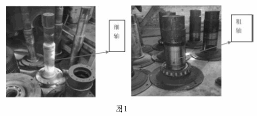 我们通过查阅资料和技术人员讨论,决定采用在原基础上加装机械密封和骨架油封的方法来解决。机械密封是与轴做相对滑动,在流体压力和补偿机构的弹力作用下保持贴合并配以辅助密封达到阻漏的轴封装置。需要在两根传动轴上均增加机械密封及骨架油封,本文详细介绍细轴的密封改造,粗轴装配原理一致。如图1,左图为行星减速箱细轴,右图为行星减速箱粗轴。