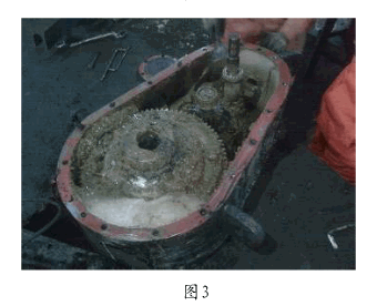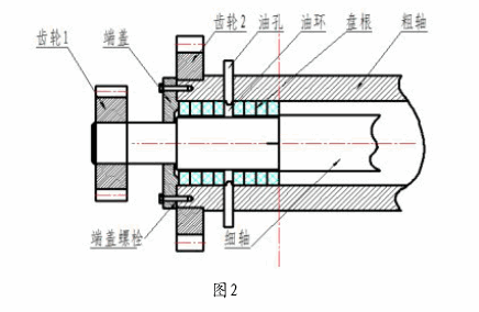 齿轮1与齿轮2分别靠键与细轴和粗轴连接。原始密封仅靠盘根进行密封;一旦盘根磨损后将导致泄漏,泄漏后各种炉内杂质进入减速箱内,将阻止轴承转动,影响溜槽动作。现场图3所示。