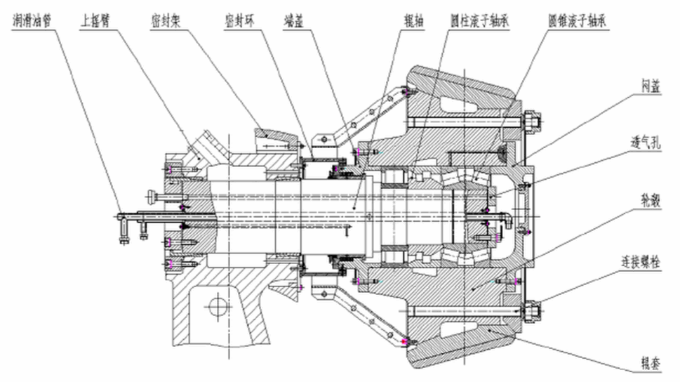 如图所示,磨辊由两组轴承支撑,圆柱滚子轴承仅承受径向力,而圆锥滚子轴承可以承受径向和轴向载荷。有这两个轴承通过间隔套定位并相互支撑。轴承通过磨辊的闷盖和端盖而压紧,轴承的配合精度由轴和轮毂的配合位置公差约束,安装时还应检查测定轴承游隙。本磨机轴承通过载荷计算,采用TIMEKEN的圆锥滚子轴承NP137279-90KA1和圆柱滚子轴承F-3197-C,使用时间应当大于30000小时。并在磨辊上采用数道密封件,端盖和轮毂间采用O型圈密封,磨辊旋转部件与辊轴之间采用双骨架唇式密封。每个磨辊上的密封装置设有环形间隙的充气式密封结构,可以防止粉尘进入磨辊内部,对轴承造成伤害。