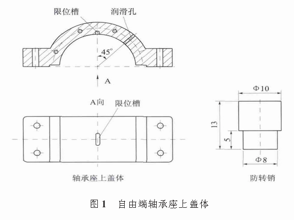 1)在自由端轴承座上盖体的内孔正中间处铣出长40mm、宽12mm、深10mm的限位槽,用45号钢加工1条防转销(见图1)。