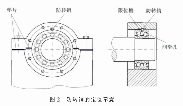 ①防转销的小头与轴承润滑孔为小量过盈配合,大头与轴承座的限位槽为大间隙配合。