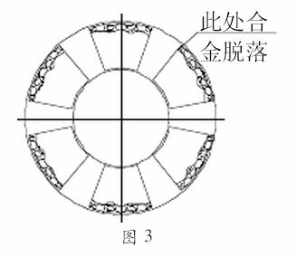 且合成轴心轨迹紊乱,因其振动频率在0.43Hz-0.5Hz之间,依据西安交通大学智能与检测研究所编制的大型回转机组典型故障诊断特征图册及设备故障诊断技术等相关理论,初步诊断此故障为油膜涡动或转子动静碰磨。为安全起见,随后利用检修机会对该台氧压机进行了解体检查,发现高压缸自由端止推轴承与油环碰磨、止推轴承瓦块外沿合金脱落(如图3),此故障现场实际情况与故障诊断分析的结果基本一致。在更换轴承后,该台氧压机运行正常,但在运行三个月后,频谱图又出现异常(现象与检查前相同),该故障又重新出现。