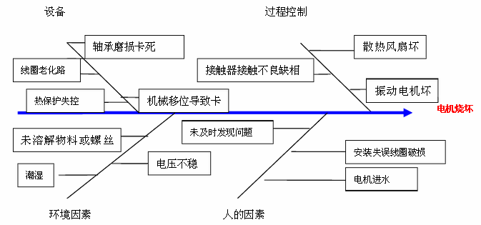 针对此情况,为Z大程度防止电机烧坏,采用全面分析建立预防发生措施,综合Z近电机烧坏分析,用因果图来解析原因。
