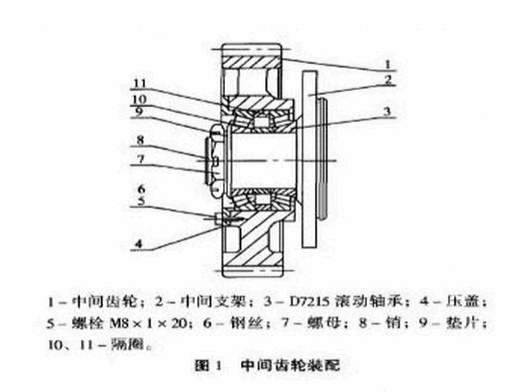 中间齿轮装配主要由中间齿轮、中间支架、滚动轴承、隔圈、压盖和螺母等组成,如图1所示,且东风4A、B、C、D、东风7系列结构完全一样(该结构于2004年进行了设计改进)。