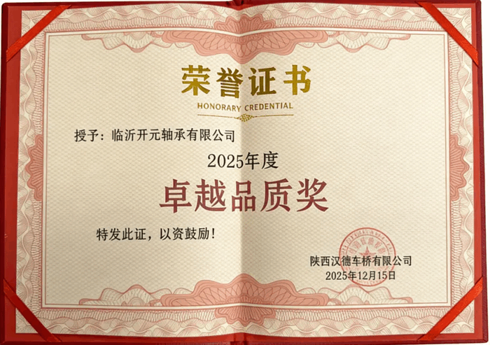 12月15日,临沂开元轴承有限公司传来喜讯,凭借过硬的产品质量与稳定的供货表现,荣获陕西汉德车桥有限公司颁发的2025年度“卓越品质奖”,这是合作方对公司产品品质与服务能力的高度认可。